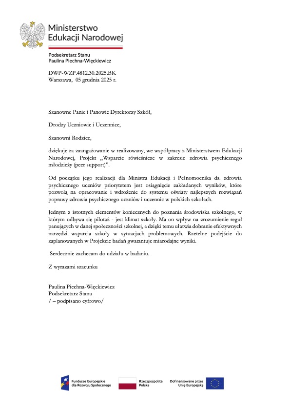 W załączeniu przekazujemy również list rekomendacyjny Pani Minister Pauliny Piechny-Więckiewicz – Podsekretarz stanu w Ministerstwie Edukacji Narodowej, podkreślający znaczenie przeprowadzenia badania KIDSCREEN.